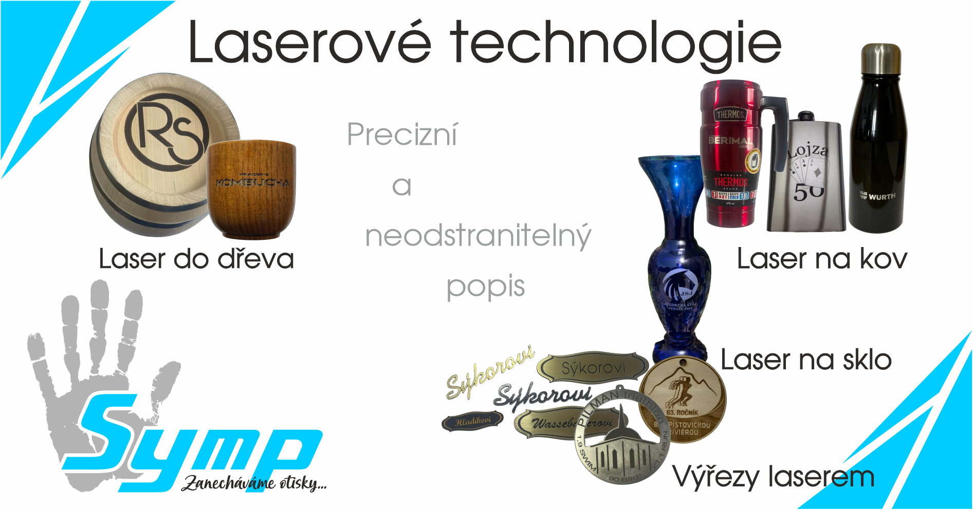 Díky našemu sortimentu různých druhů laserů, jsme schopni značit na pestrou škálu materiálů jako dřevo, všechny druhy kovů, kůži i koženku, korek a i na některé druhy plastů. Výsledný popis je nesmazatelný a může mít různé odstíny (podle materiálu a nastavených parametrů).